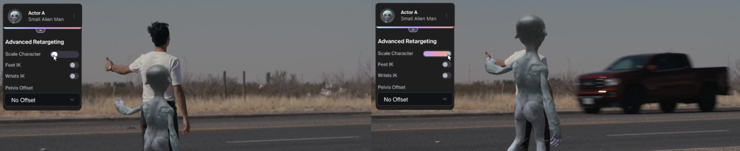 The system automatically detects the actor’s performance based on single-camera footage. Then, it takes that performance and transfers it to the CG character of your choice — automatically animated, lit, and composed.